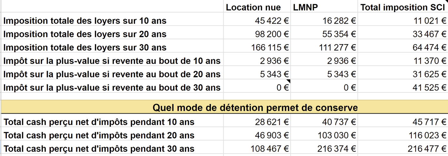 On constate plusieurs choses ici que l’imposition en location nue est très élevée même si l’on tient compte de la plus-value à la revente qui est avantageuse au bout de 30 ans (lol).