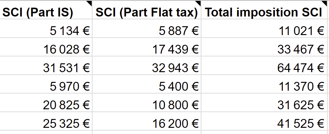 Voilà comment se décompose l'impôt en IS et Flat tax lorsque l'argent sort de la SCI :