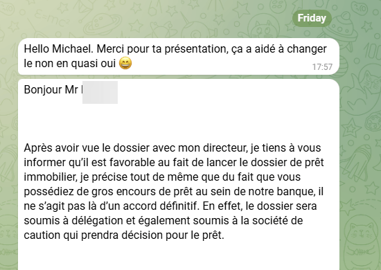 Comme cette personne, si vous avez un dossier bien préparé vous passez instantanément du refus à un quasi oui. C'est 50% du travail.