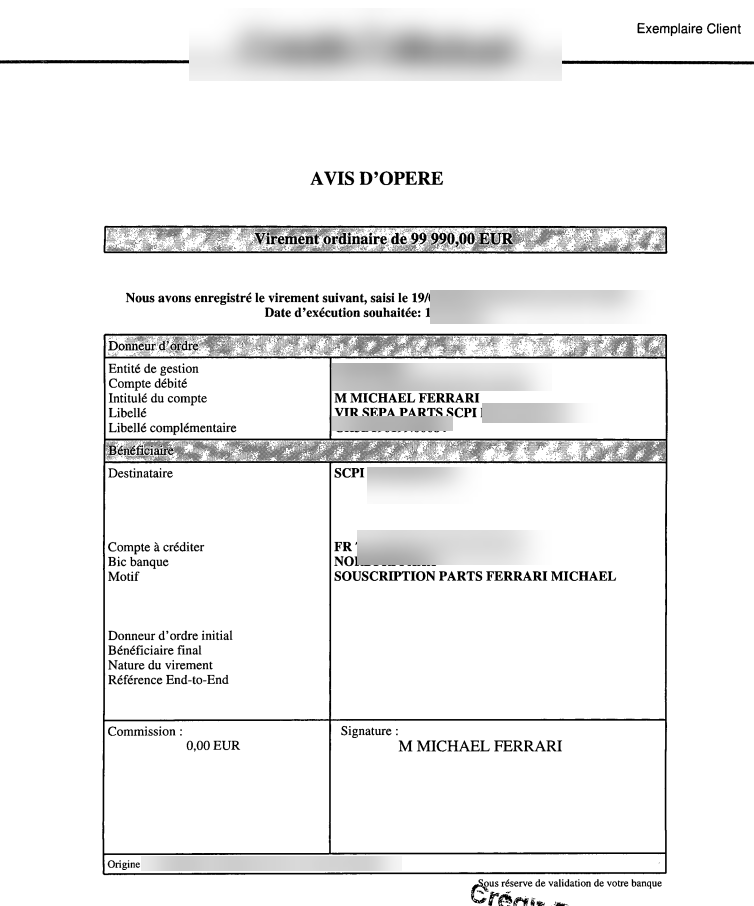 Voici l'avis d'opéré de l'un de mes financements de parts de SCPI