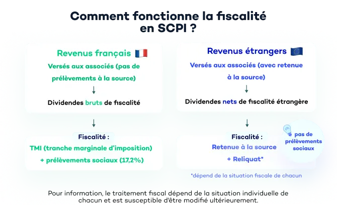 Par exemple, si la SCPI détient un bien en Allemagne, vous ne serez fiscalisé qu'à hauteur de 15,82% sur vos loyers + votre imposition sur le revenu.